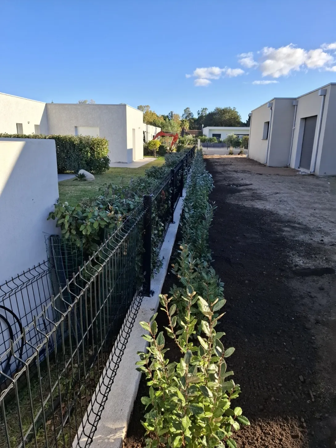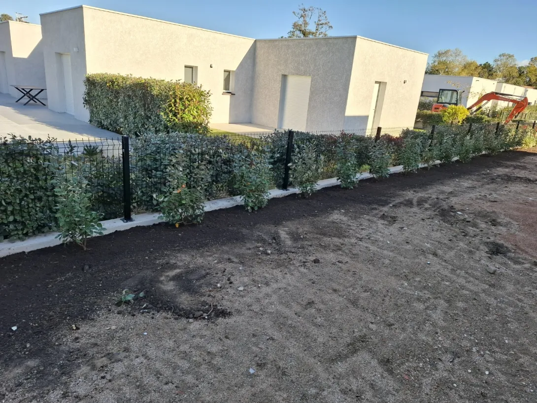 Notre nouveau chantier a fait l'objet d'une création de haie brise vue. Après la pose de grillage chez un particulier, votre entreprise de terrassement et démaquisage a effectué une plantation d'arbustes pour une future haie brise vue.